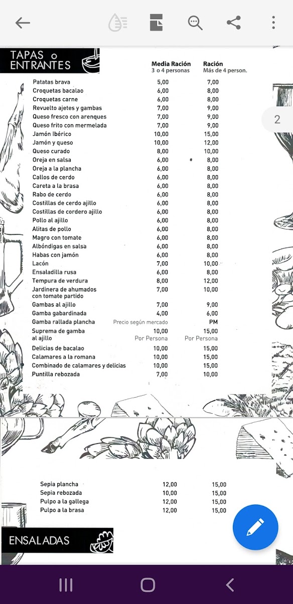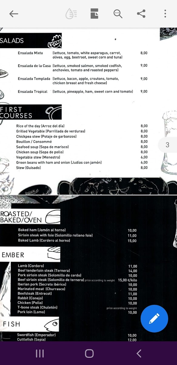 Typical choices include rich, meaty options like Secreto Ibérico and Chuletón de Ternera, alongside timeless favorites such as Paella and Gazpacho Andaluz. Lighter touches like Ensalada de Cortesía and fresh fruit complement the heavier plates, providing balance on the plate.